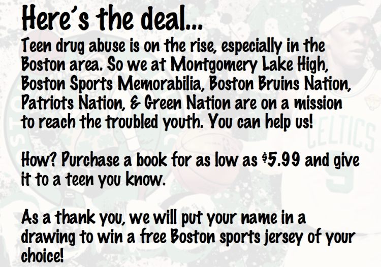 Brought to you by the Montgomery Lake High book series in partnership with Green Nation, Boston Bruins Nation, Patriots Nation, Boston Sports Memorabilia, and New England Social Network Advertising. Promotion running until 5/25/12.